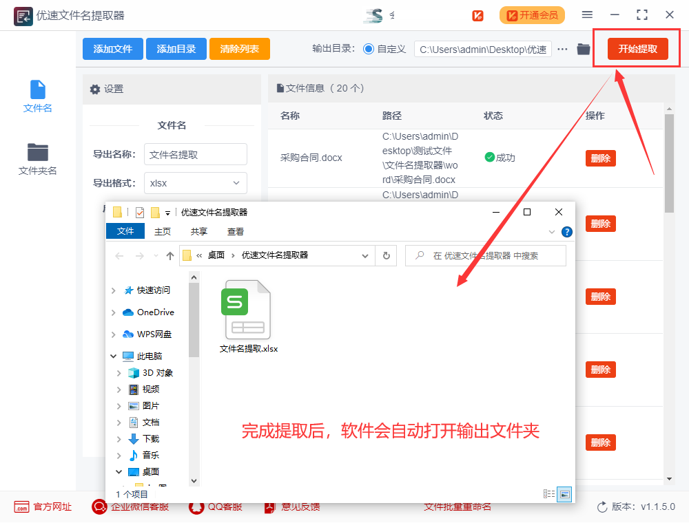 最后我们点击软件右上角的【开始提取】红色按钮,这样软件就开始执行文件名的提取工作了,完成提取后软件会立即弹出输出文件夹,可以看到包含所有文件名的excel导出文件就保存在这里。