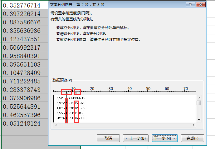 2. 在数据预览的标尺处点击,生成分割线,左右拖动分割线,放在要分割的位置,点下一步。