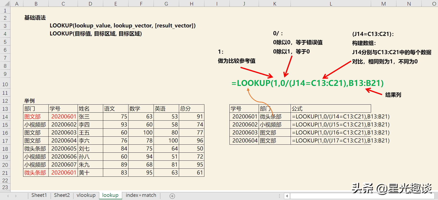 0除以任何非零值都是0,当匹配数组中出现多个0时,由于0总比参考值1小,所以,总是返回最后1个0,对应的位置。 比如:20200601,对应图文部、微头条部,都满足条件,只返回最后出现的微头条部。