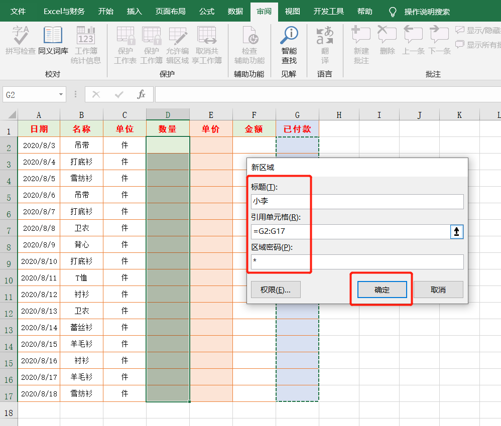 五、设置小李编辑权限:继续点击【新建】按钮,标题输入:小李 ,引用单元格选择G2:G17单元格区域,区域密码输入3,点击【确定】返回工作区。