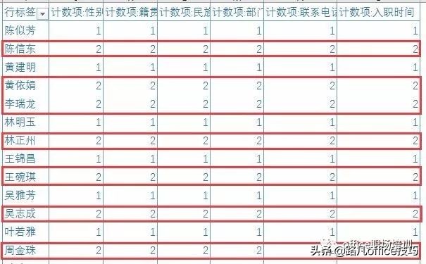 在字段列表中,把“姓名”拖入“行标签”区域内,把“性别”、“籍贯”、“民族”、“部门”、“联系电话”、“入职时间”等拖入“值”区域内。并将“联系电话”字段的值汇总方式设置为“计数”,结果出来后,计数项不为 1的行代表存在重复项