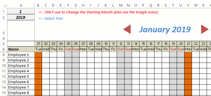此模板具有选择工作日和非工作日的内置功能。它也会自动考虑指定的假期。