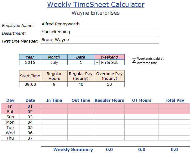 一个时间表计算器模板,它将计算正常和加班时间的总数以及基于时间和超时时间的总支出。提供 3 种格式 - 每周、每两周和每月。