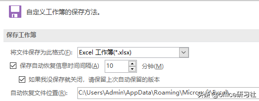 单击【文件】-【选择】-【保存】,在【保存工作簿】栏勾选自动恢复,并且选择恢复位置: