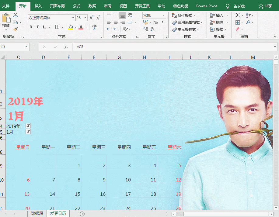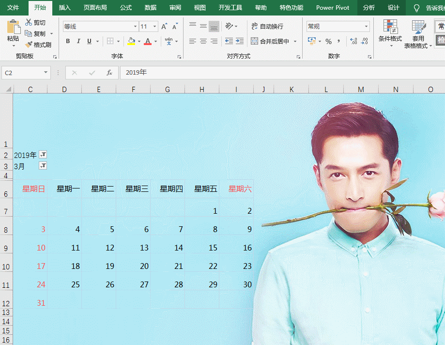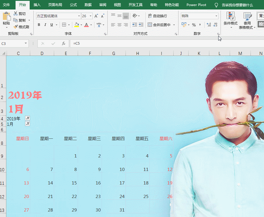 新插入两行,在 C2 单元格输入公式「=C4」,在C3 单元格输入「=C5」,设置 C4、C5 单元格的字体为方正剪纸体,大小 26 号。试试筛选别的年份和月份,果然完美解决啦。