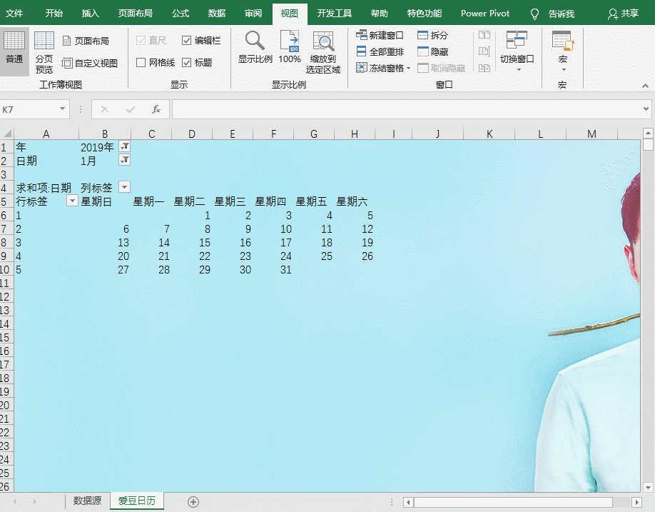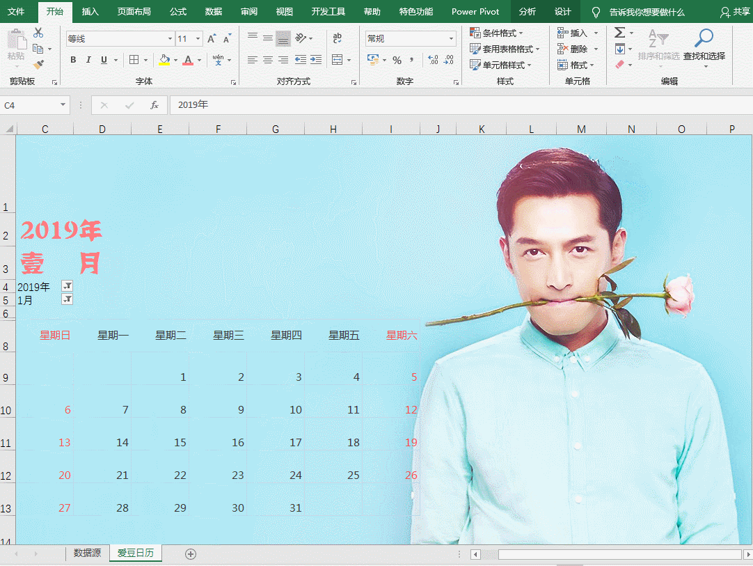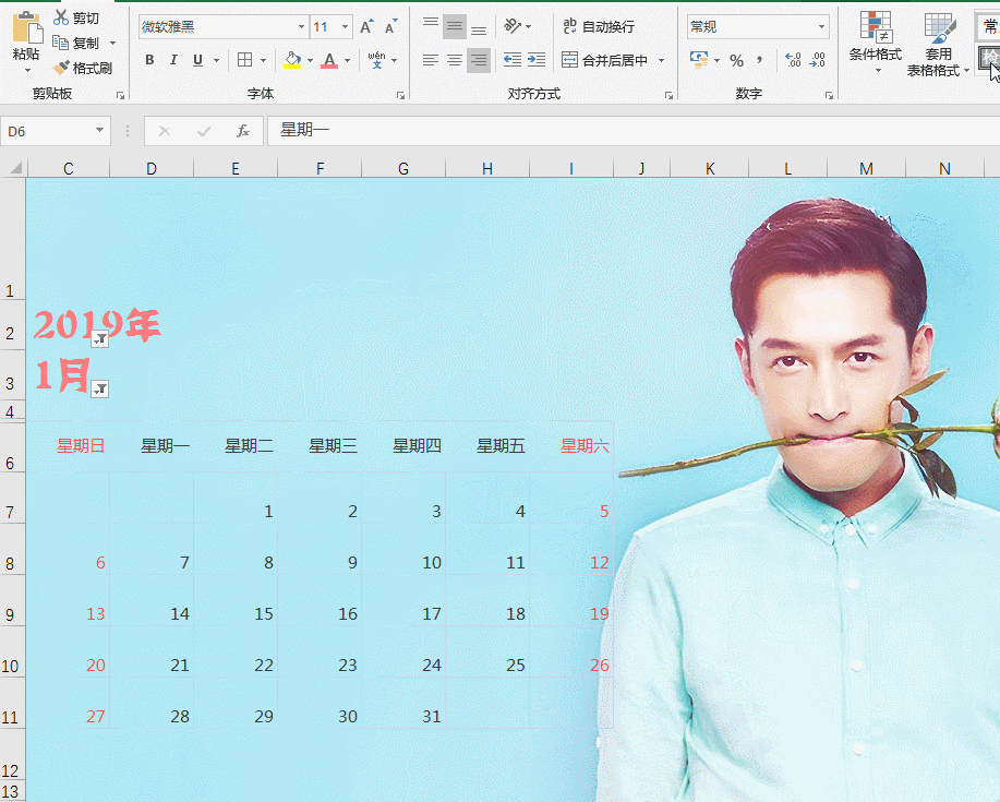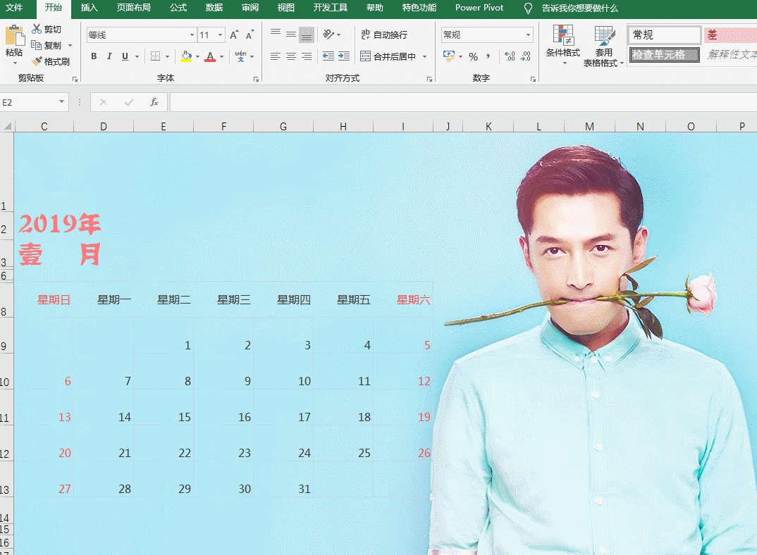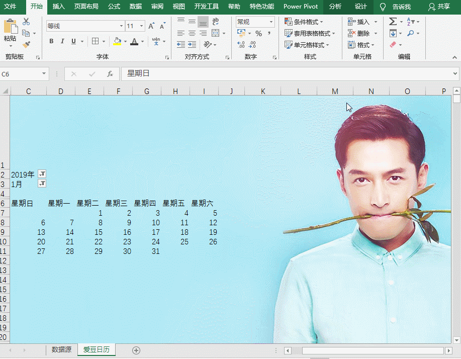 首先在 A 列数据前插入新的一列,将列宽拉大,让日历即数据透视表和胡歌的头像靠近一点(根据图片不同适当调整)。
