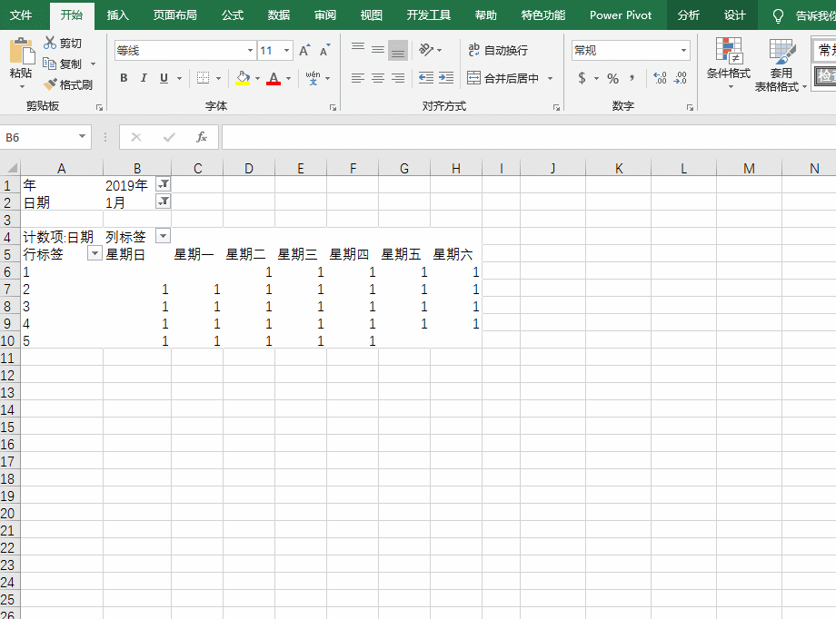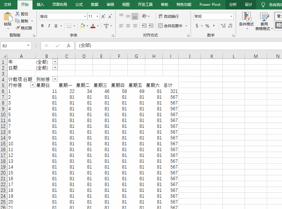 在右侧数据透视表字段里,将字段「日期」拖到下面的「行」里,Excel 2016 会自动对日期进行分组,删去不需要汇总的「季度」字段,将年、日期拉到筛选里,将周次拖到行,星期拖到列,再将日期拖到值里。