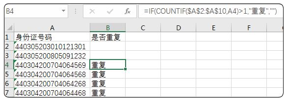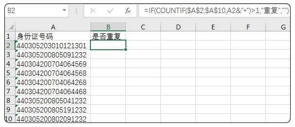 如图3-9-25所示,在B列使用下面的公式,判断A列的身份证号码是否重复。