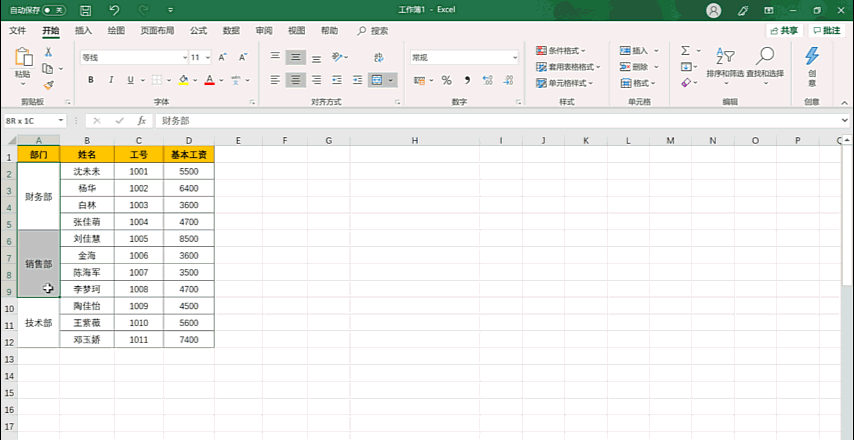 最简单的合并单元格方式就是:框选要合并的单元格,一键点击【合并后居中】。