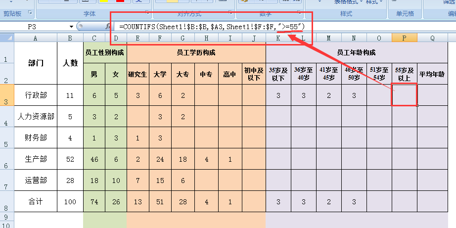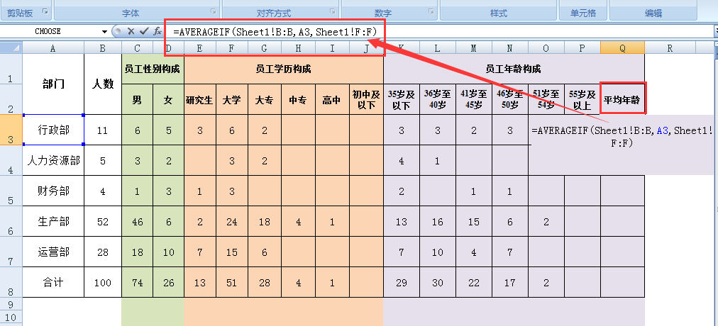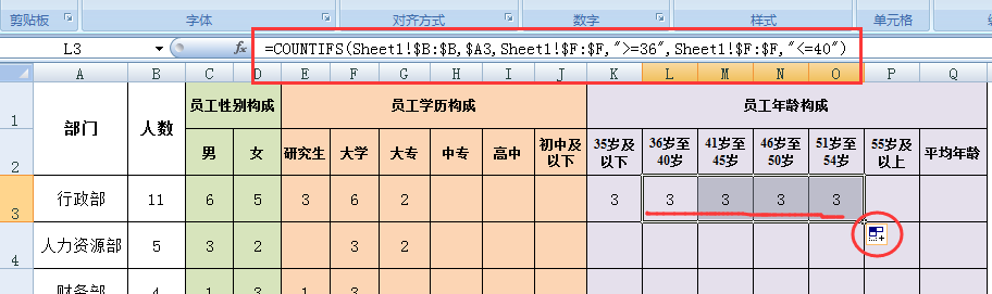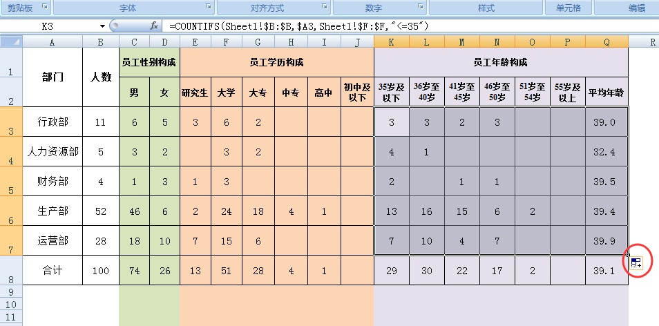 求出第三行员工年龄构成所有数据后,将公式数据拉填至Q7单元格,即求出所有部门的员工年龄构成情况: