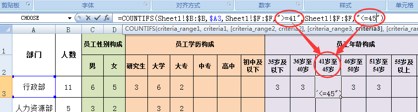 这里输入的公式与前面的基本是一样的,只是最后一个参数“<=35”要根据内容进行修改,因为EXCEL执行语句是根据系统特定标识符来运算的,表中的“35岁及以下”这个数据电脑是不能识别的: