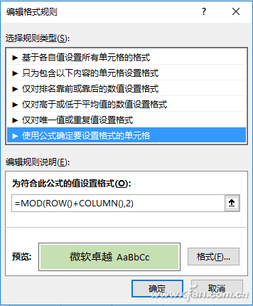 当然,如果把公式变化一下,出现的填充效果就又不一样了。如公式变成“=MOD(ROW(),2)”,就变成了隔行填充。此条件格式的公式用于判断当前行是否为偶数行,如果是,则填充颜色到单元格中,否则就不填充。如果将公式改为“=MOD(ROW(),3)=1”,就是每3行填充一次了。如果希望设置奇偶列不同底纹,只要把公式中的ROW()改为COLUMN()即可,如“=MOD(COLUMN(),2)”(图4)