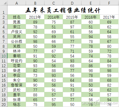 以一张销售统计表为例。首先,选择A2:F20区域。点击“开始”选项卡,选择“条件格式→新建规则”命令,在弹出的窗口中选择“使用公式确定要设置格式的单元格”,在“为符合此公式的值设置格式”处输入“=MOD(ROW()+COLUMN(),2)”;点击“格式”按钮,在“设置单元格格式”对话框的“填充”选项卡中选择单元格底纹的填充色,如浅绿色;最后确定就会出现棋盘式的效果了(图2)。