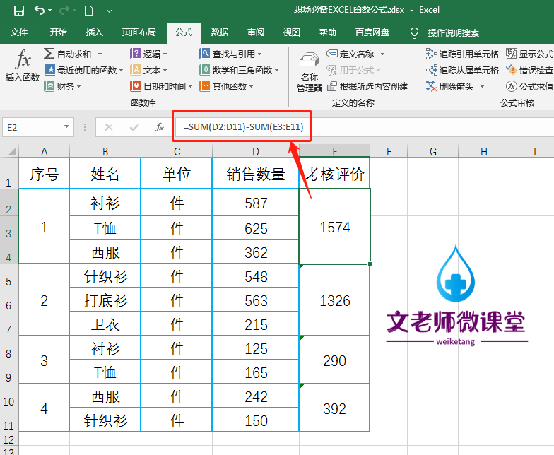 公式如下:=SUM(D2:D11)-SUM(E3:E11)