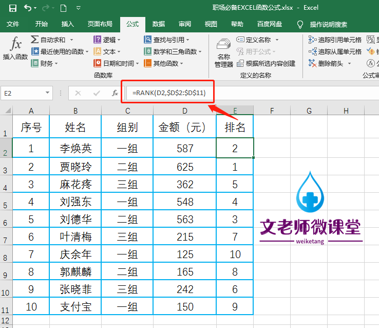 提示小伙伴们一下,参与排名的数据($D$2:$D$11)一定要用绝对引用,不然返回结果不正确。