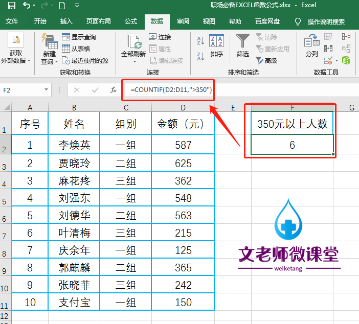 解析一下公式:D2:D11是数据区域,">350"是条件表达式(也就是条件)。