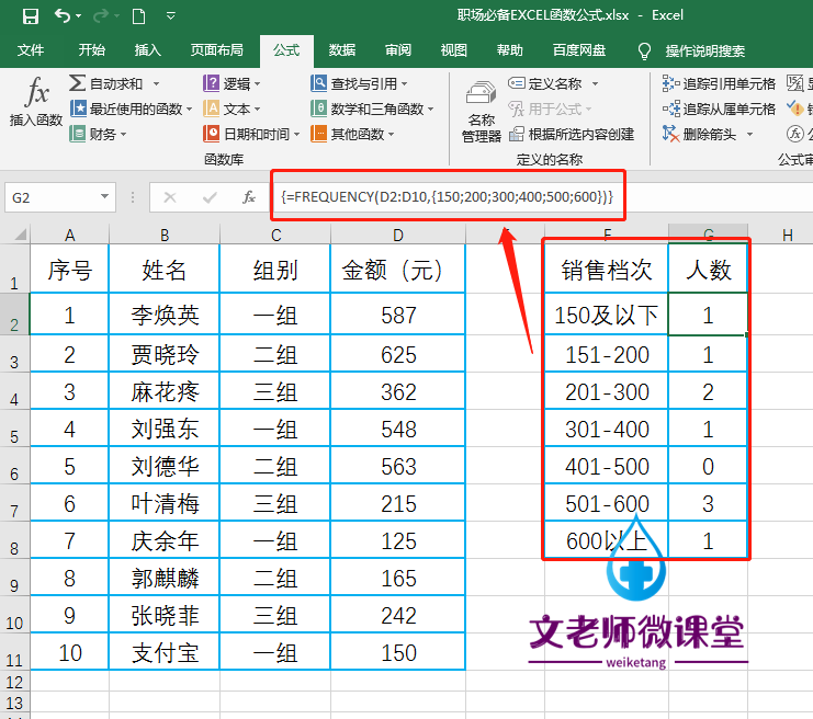 公式如下:=FREQUENCY(D2:D10,{150;200;300;400;500;600})