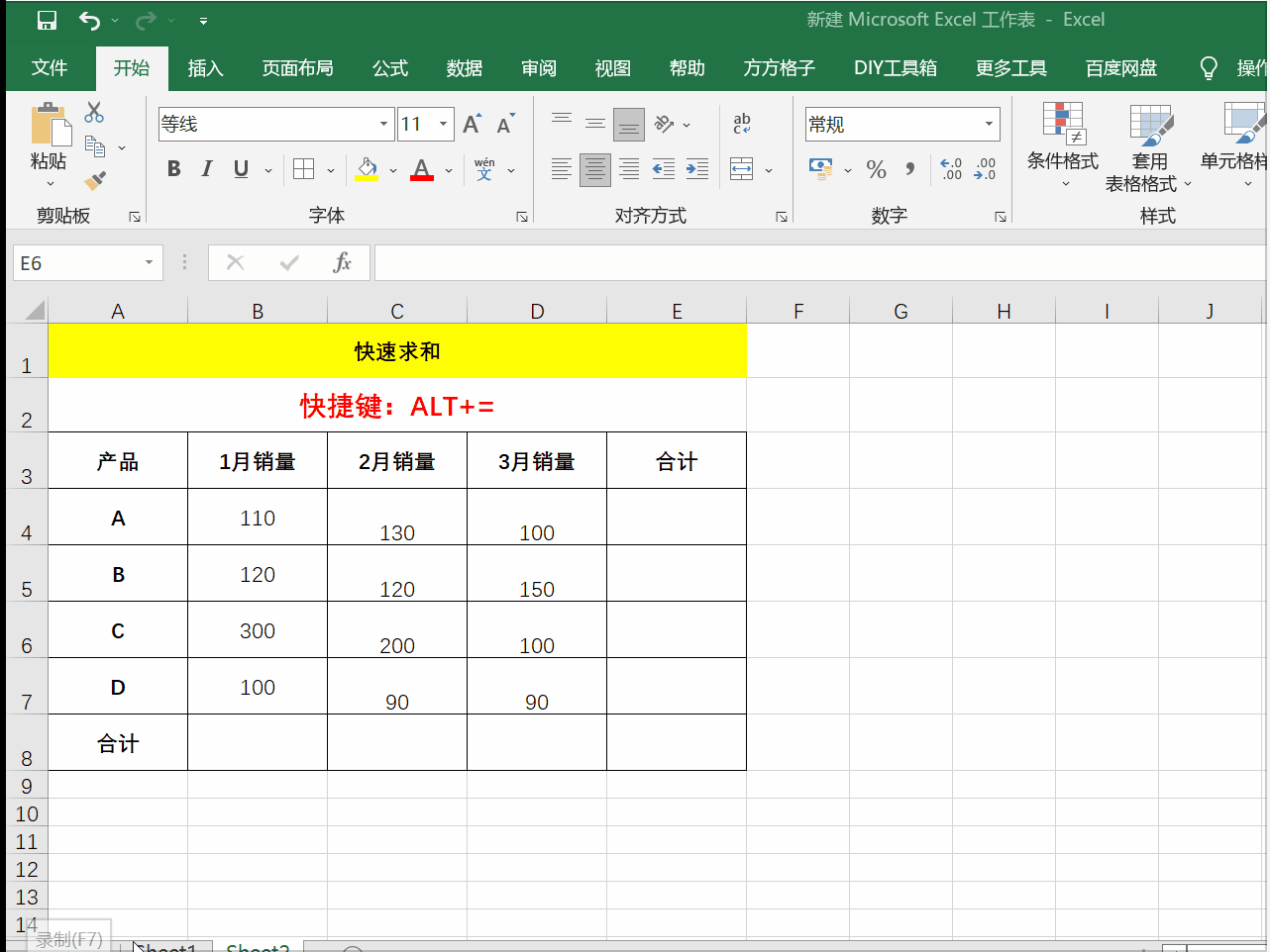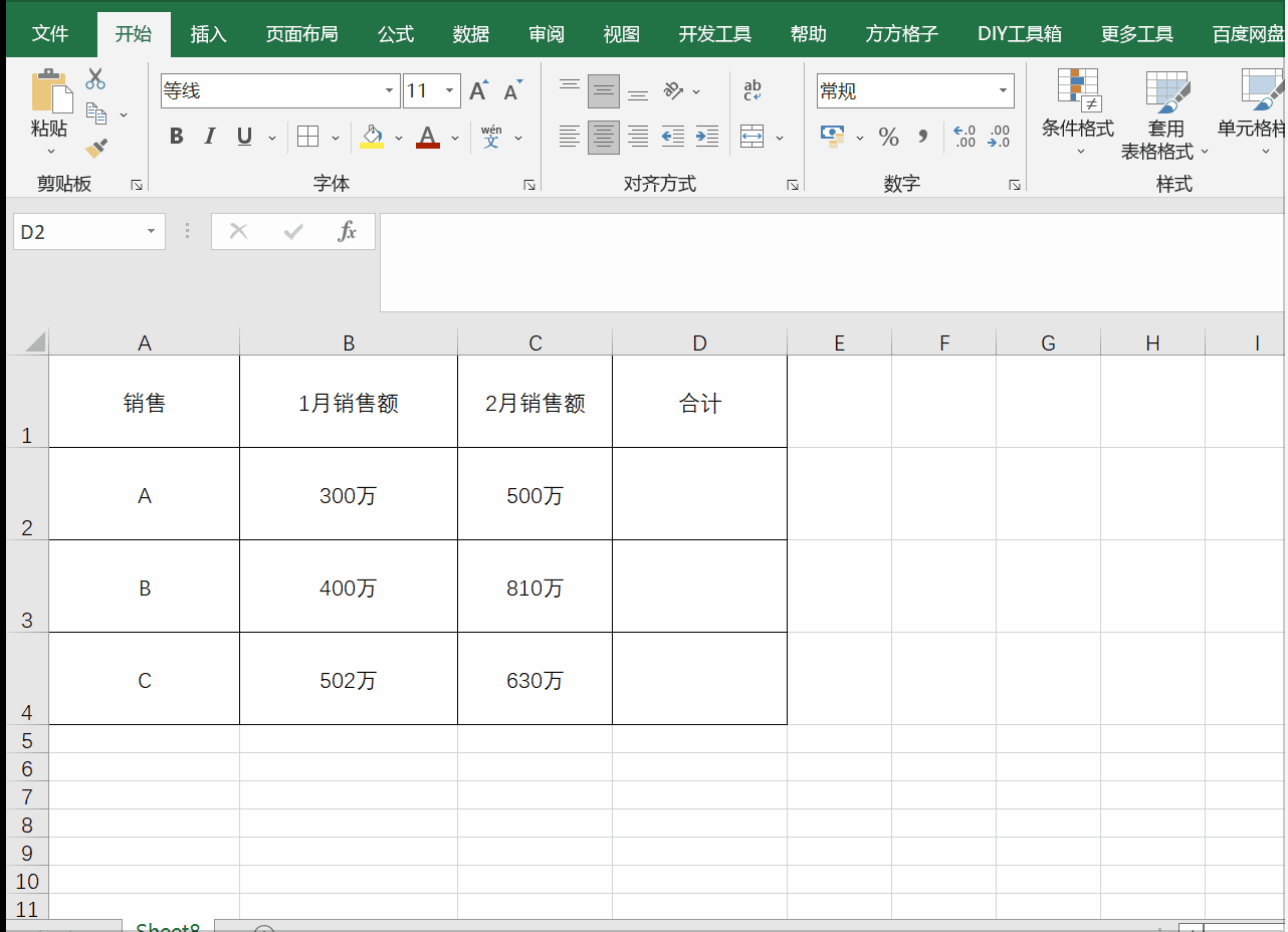 操作步骤:如图中,要计算1月和2月的总销售额,首先在D2单元格输入“S=300+500”,然后按快捷键