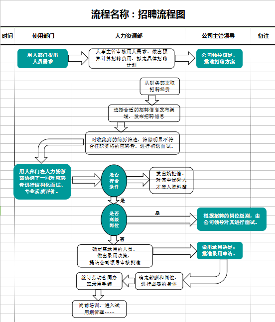 メ多色招聘流程图,青色表格框架,完整内容。メ