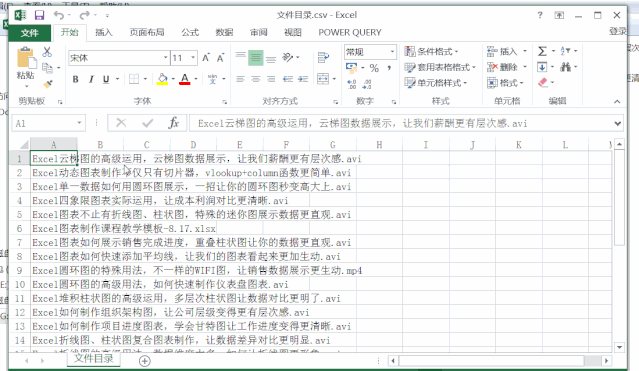 第三步:我们在出现文件:“创建目录.csv”后,双击文件就会以Excel打开对应的内容。文件夹中所有的文件名都会被调用到CSV文件中。然后我们新建目录栏辅助列,输入以下函数: