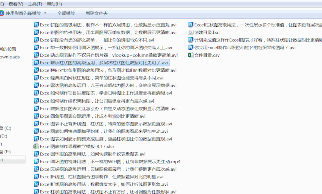 如上图所示,我们的文件夹中包含有26个视频和Excel文件,因为文件数量过多所以我们需要利用Excel来制作一个文件目录,以便于我们快速找到及打开对应的文件内容。效果图如下: