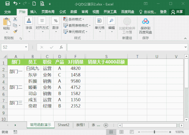 函数公式=SUMIF(F2:F8,">4000"),第一个参数是条件区域,第二个参数是条件。