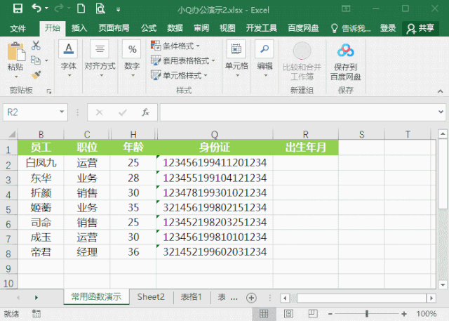 函数公式=--TEXT(MID(Q2,7,8),"0-00-00"),获取的函数还有很多,这里用mid函数先提取出生日期字符,再转换为文本的日期格式,加上【--】是将文本日期转换为真正的日期序列值。