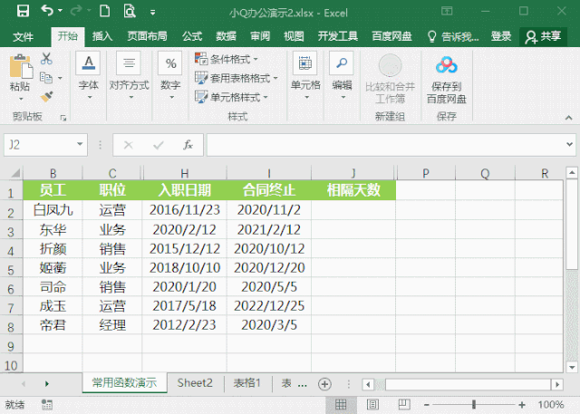 函数公式=DATEDIF(H2,I2,"d"),DATEDIF函数就是计算日期相隔天数。