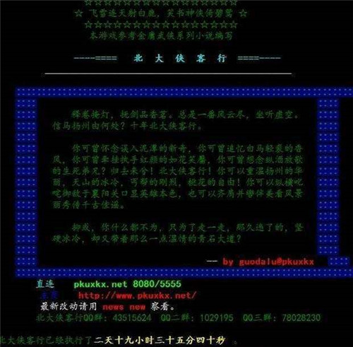 第一款国产网络游戏叫做《北大侠客行》,没有现在网络游戏那些炫酷的画面和技能特效,只有满屏的文字,不能通过鼠标点击来操作,而是要不断输入指令执行,据说当初方舟子因为在海外留学期间,对台湾的MUD游戏感到失望,回国后跟同伴借鉴外国MUD机制,基于金庸小说剧情制作出的MUD,因为服务器放在北京大学东门物理楼而得名,从1996诞生至今,这款游戏依旧还在运营,而且拥有一批忠实的玩家,而第一款国产图形网络游戏,应该是《万王之王》。