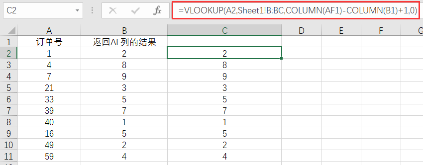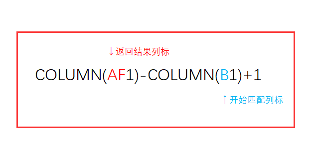 我们要返回的结果是AF列的,这个VLOOKUP的函数是从B列开始的,所以我们只需要第3个参数改成Column(AF1)-Column(B1)+1即可,最后一个参数为0