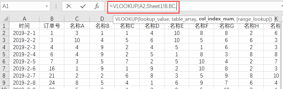 整体公式为:=VLOOKUP(A2,Sheet1!B:BC,COLUMN(AF1)-COLUMN(B1)+1,0)