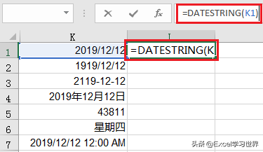* 请注意:第 6 行的“星期四”也是日期格式,如果输入文本“星期四”,datestring 函数结果会返回错误值。