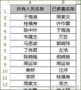左边A列是所有人员名单,B列是从A列中抽出来参数名单。现在的问题参赛人员还不够,还需要继续从A列名单中,抽取一些人员出来参赛。