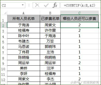 我们用C列做辅助列,C2单元格输入公式:=COUNTIF(A:B,A2),然后下拉。可以看到有些是2、有些是1。返回2的对应A列的名单就已经使用过了。返回1的,对应A列的名单就可以抽取出来参赛。