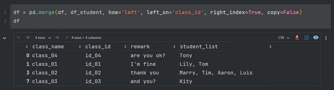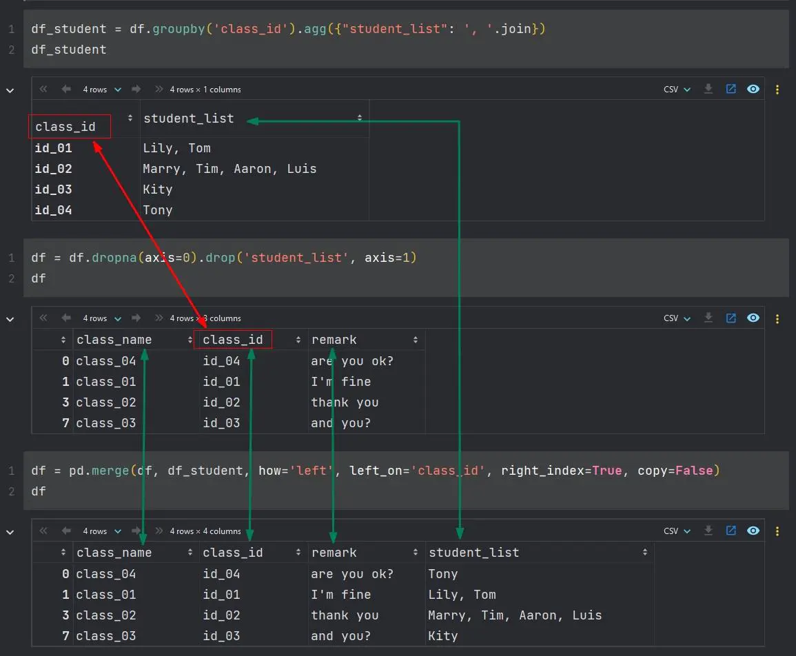 本步骤需要对没有合并单元格的列根据上一步中所使用的列进行分组,并将组内的数据使用,连接起来。本例中使用的没有合并单元格的列是student_list列。可以看到示例数据集已经被根据class_id分为4组,且各组内的student_list元素已分别被,连接起来放到一个单元格中,新生成的 df_student数据集的索引是class_id。