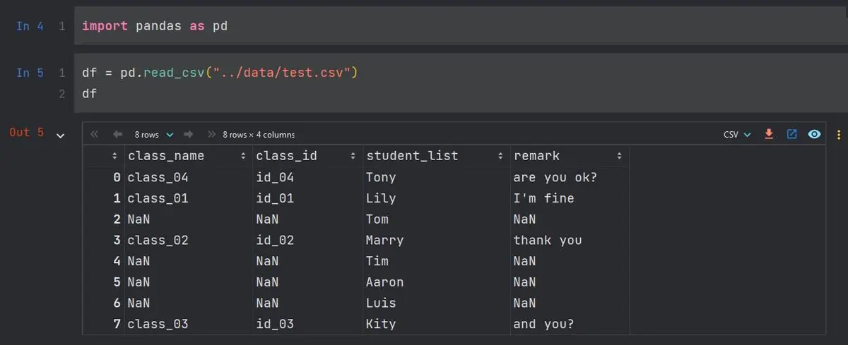 可以看到将数据读取到DataFrame后,在有合并单元格的列中,将会有值为NaN的单元格出现