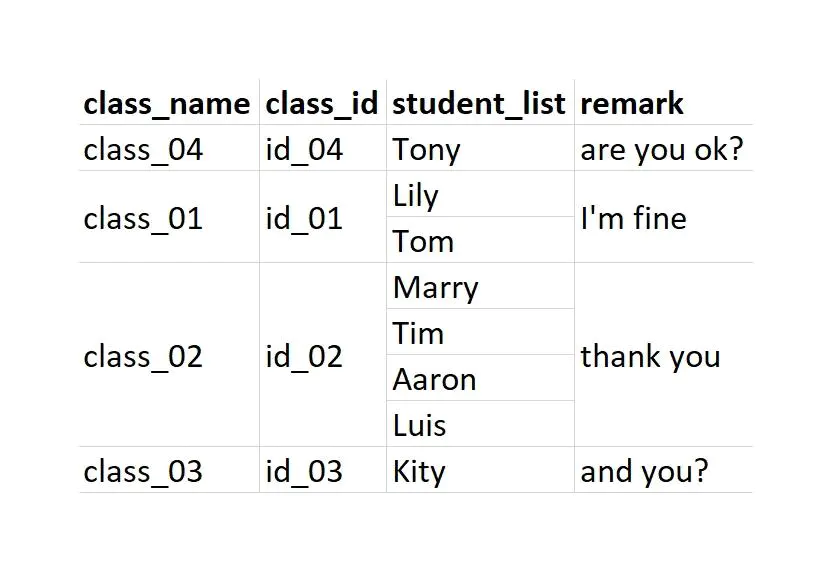 - 如果是class_id这一列,则整理后的结果将成为4行,同一个class_id下的student_list将会被合并到一个单元格内,可以考虑使用 , 将不同的元素隔开