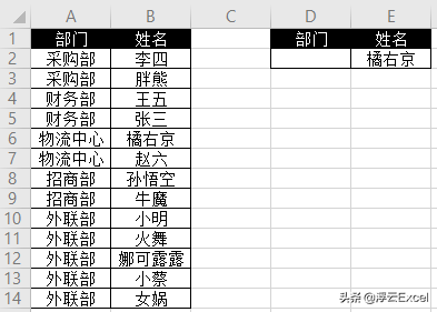 如下图所示,需要根据E列的姓名在A列查询对应的部门。
