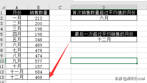 :B2:B13>AVERAGE(B2:B13)部分,是用B2:B13的平均值,分别做比较,得到由逻辑值TRUE或FALSE组成的数组。