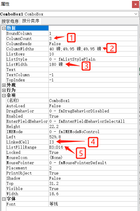 ColumnCount:设置为3;(组合框下拉菜单呈现数据的列数,数字3表示三列,数字2表示二列)