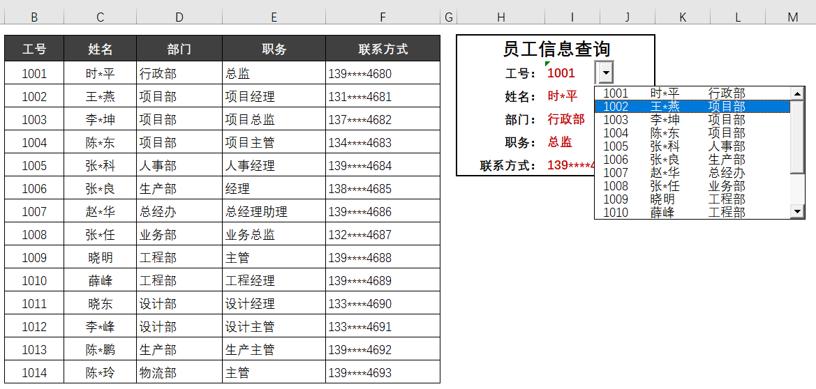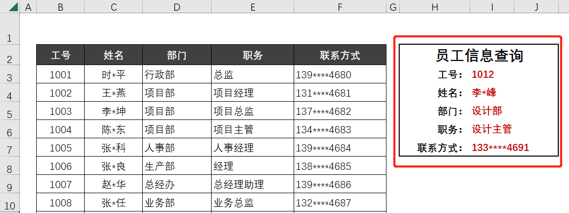 2、设计“员工信息查询”表格,编辑好函数,通过“I3”单元格的工号检索出姓名、部门、职务、联系方式等信息。