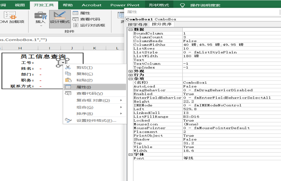 ListFillRange:设置为B3:D16。(是组合框数据来源,此例中数据来源为左边员工信息表中的B3:D16 。这里也可以使用【定义名称】,以达到动态引用数据源的目的。如果使用定义名称,可以直接输入名称。)