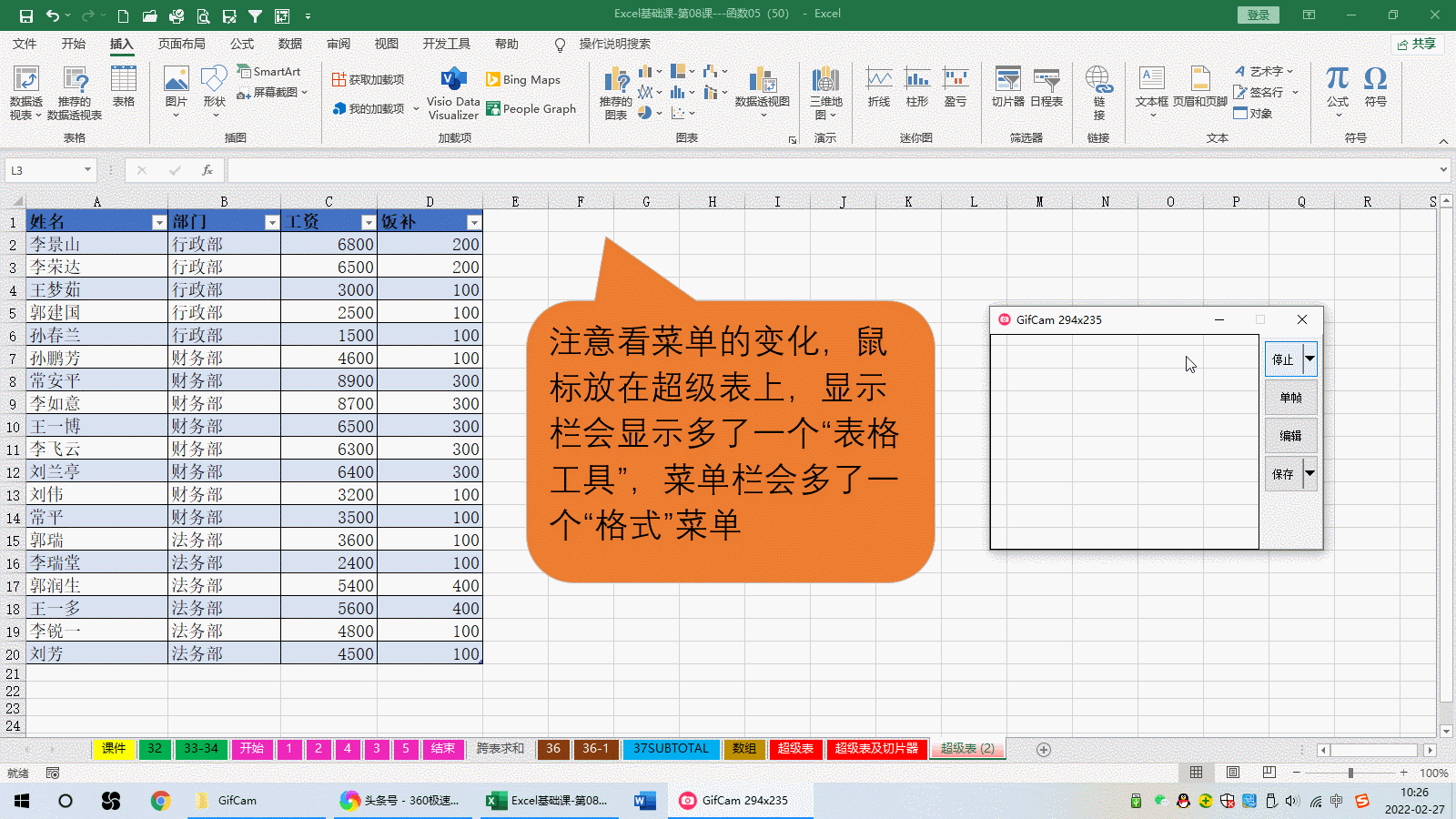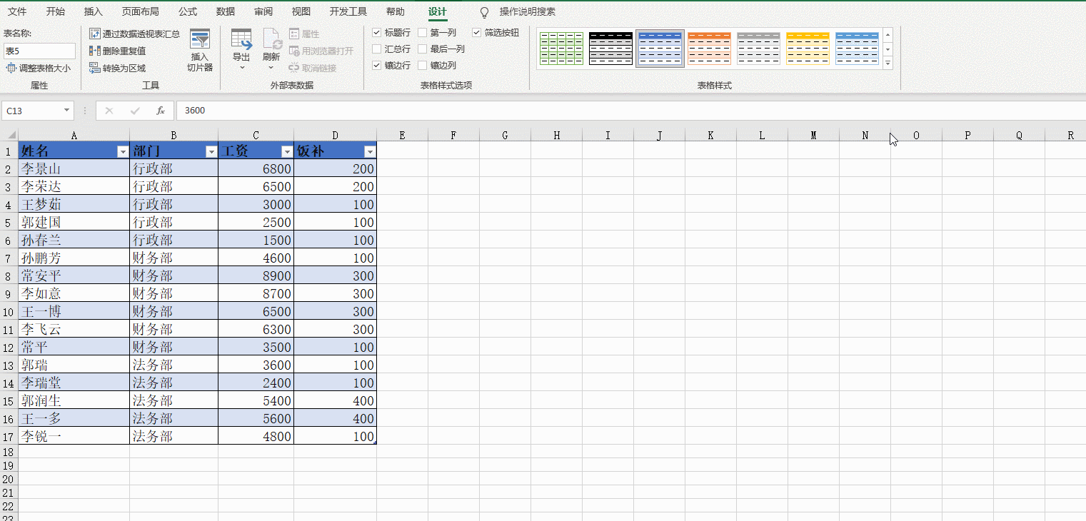 建立好了超级表,我们注意看下面的动图,普通表和超级表状态下菜单栏显示有区别,超级表会有一个专属格式菜单供我们使用。这个菜单也是区别普通表和超级表的重要标识,如果把光标放在表上,出现了这个菜单就表明这个表是超级表,否则,即使表样显示的是超级表的表样,没有出现这个专属菜单,一样不是超级表,而是普通表。