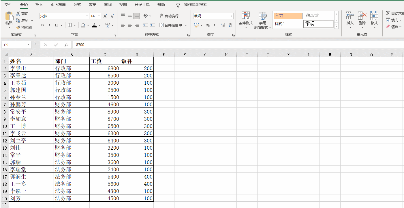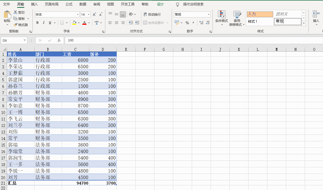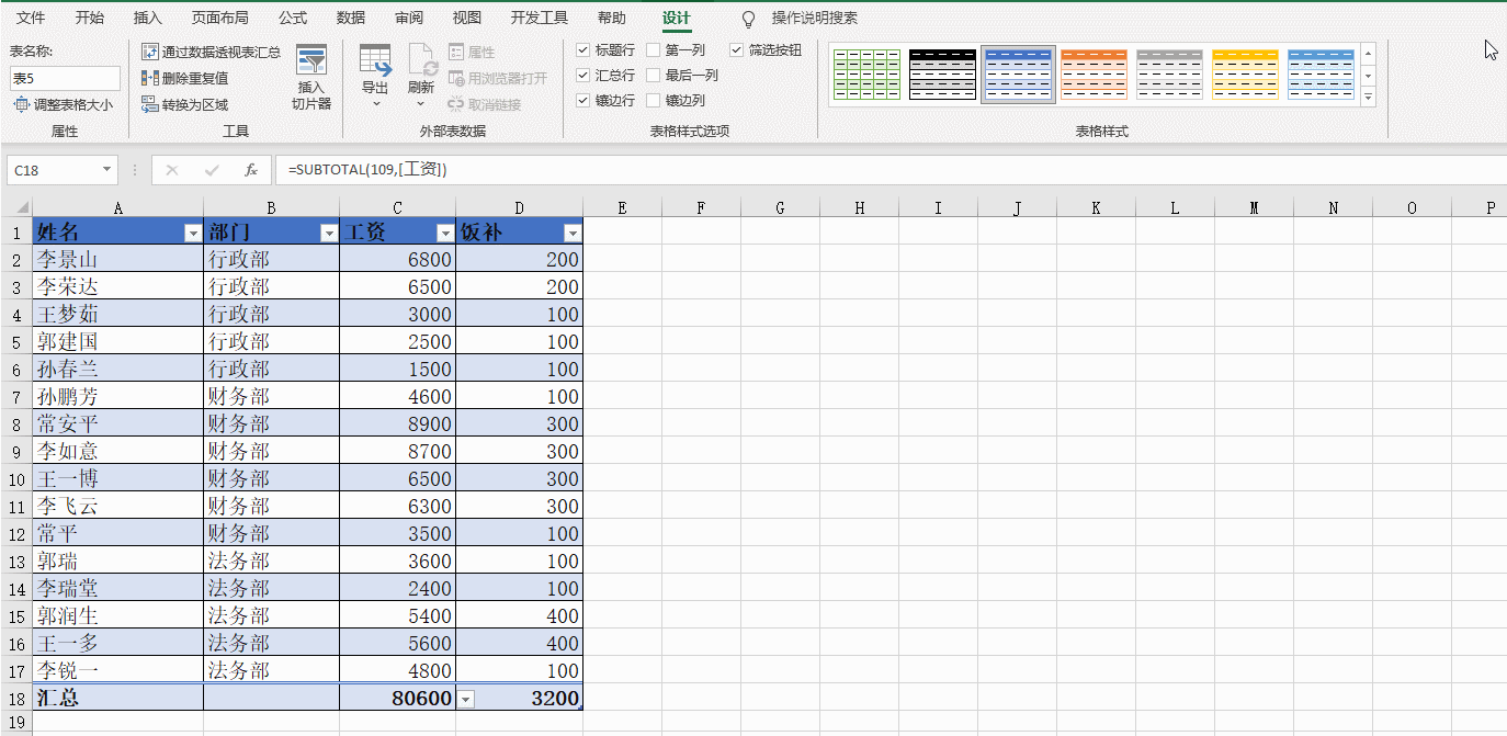 我们来看最后一列的汇总求和公式=SUBTOTAL(109,[饭补]),公式里的计算区域在普通表里是D2:D17,这里直接用[饭补]代替了,这也是超级表的一个特色,不仅是这个公式,超级表里所有的公式默认都是用这样的方式设置公式。前面建立超级表的时候不是有一个勾选“表包含标题”吗?其实就是用原有的列标题给列取了个“名字”。