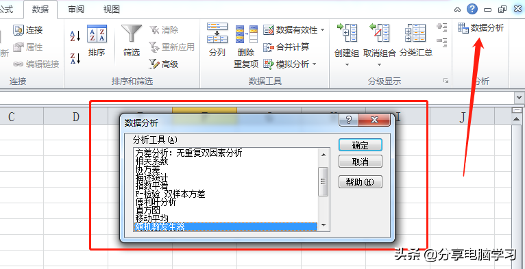 点击【数据分析】选项卡,可以看出excel有如下几种数据分析工具,如图所示