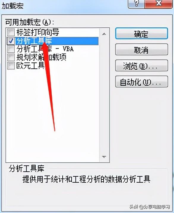在出现的加载宏窗口中勾选分析工具库,点击确定,如图所示(若出现未安装弹框提示,则点击是进行安装)