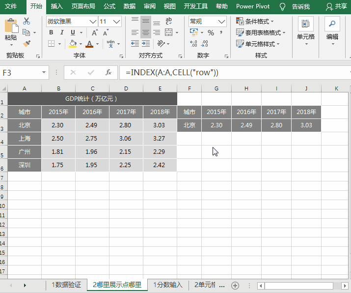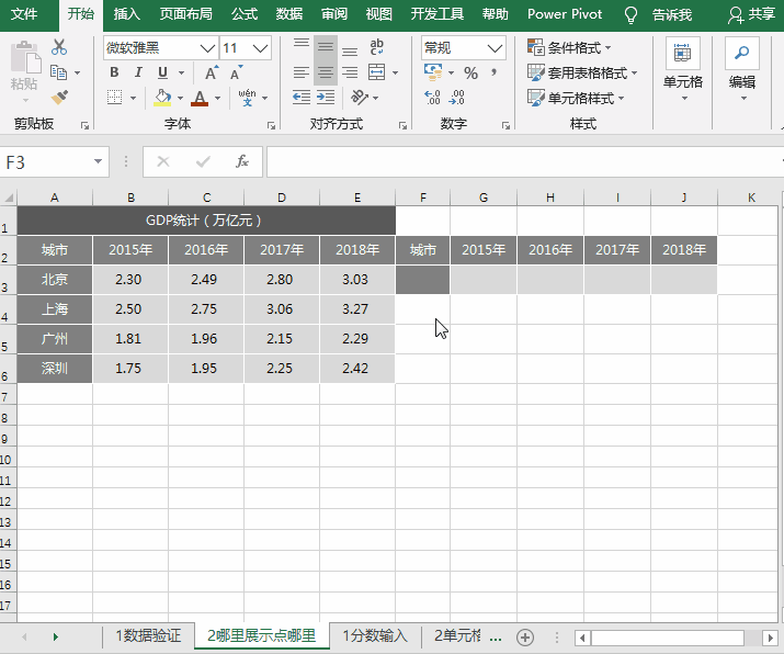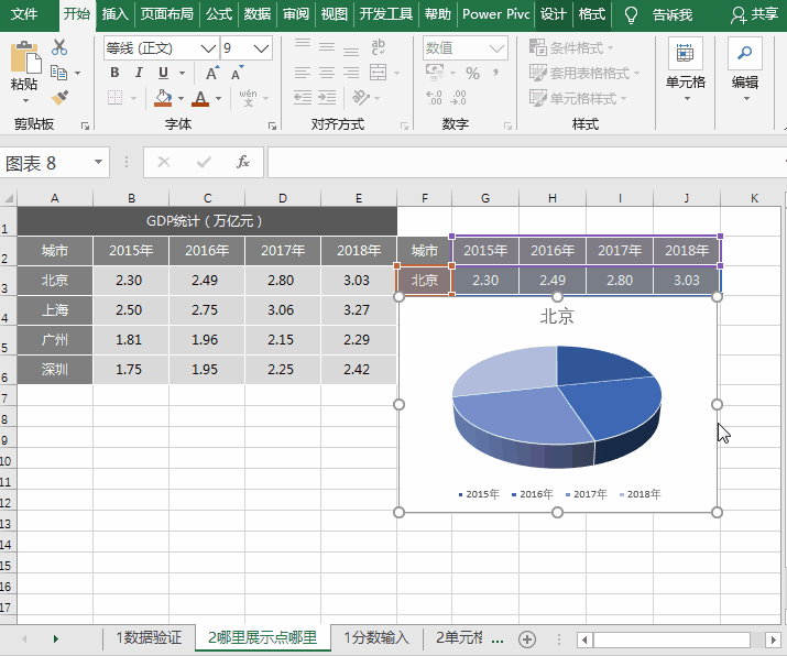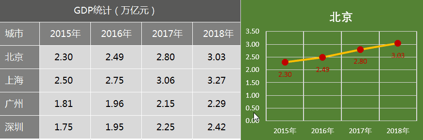 原始数据为2015年-2018年北上广深四大城市的GDP数据,其中数据位于B3:E6单元格中。