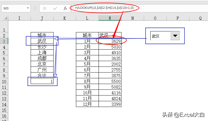 "M2"单元格里的公式为:=INDEX(J3:J9,J10),用J10单元格里的需要直接引用城市序列里的城市。