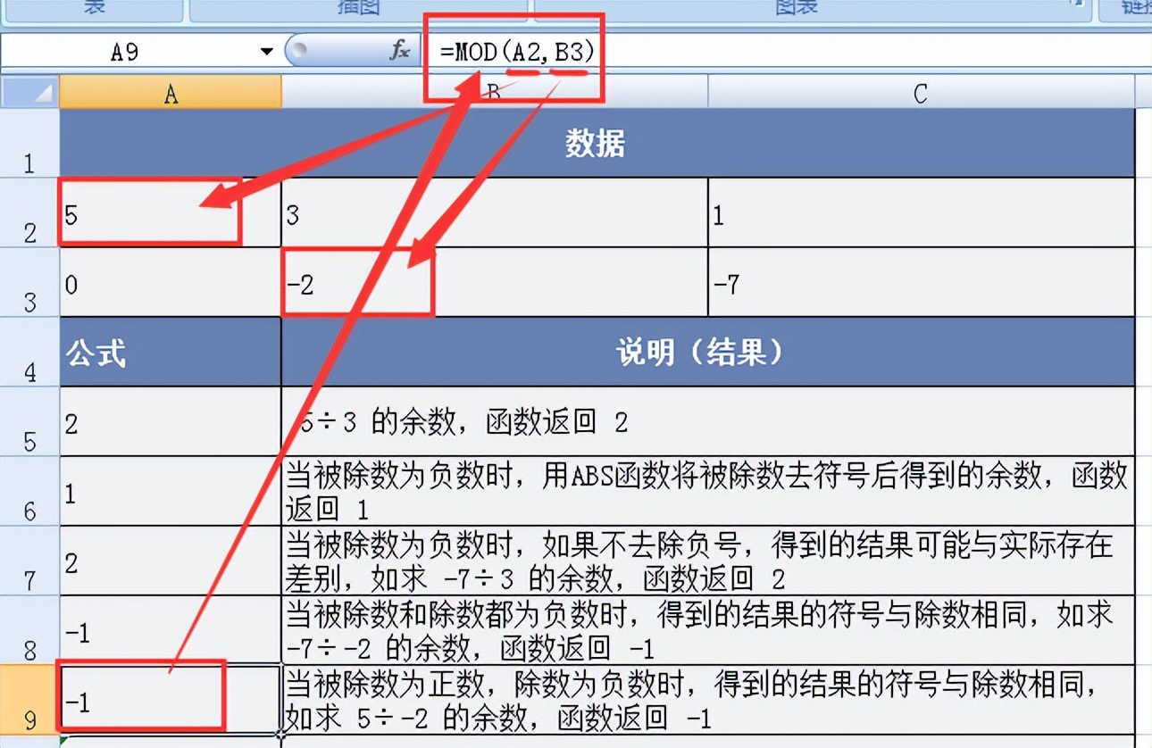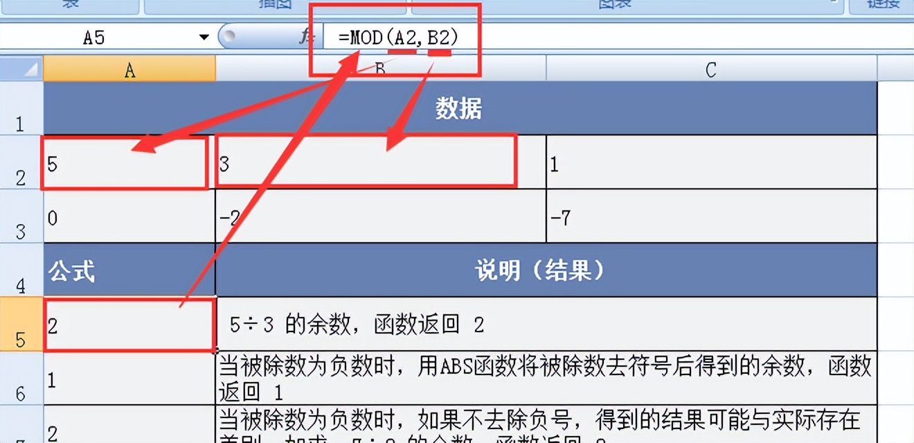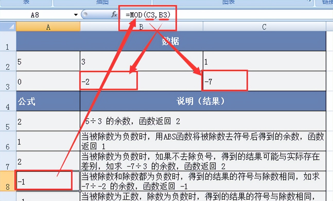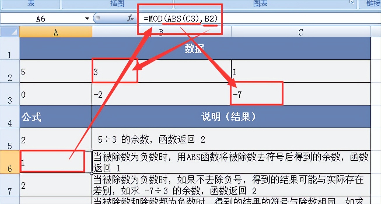 图例2:当被除数为负数,除数为正数时,如果不用ABS函数将被除数的负号去掉,得到的结果可能与实际存在差别:
