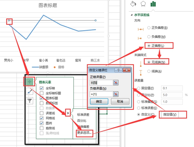 4.设定线长度。选择目标的点,点图表加号,选择误差线、更多选项,指定值的大小决定横线的长度,可以自己尝试,一般来说销售额有几个值,正错误值就输入几。